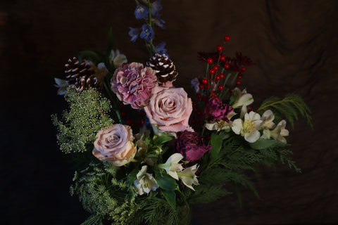 Petite size includes 2-3 stems of roses or(and) large chrysanthemum, lilies, anemones, ranunculus with carnations and berries