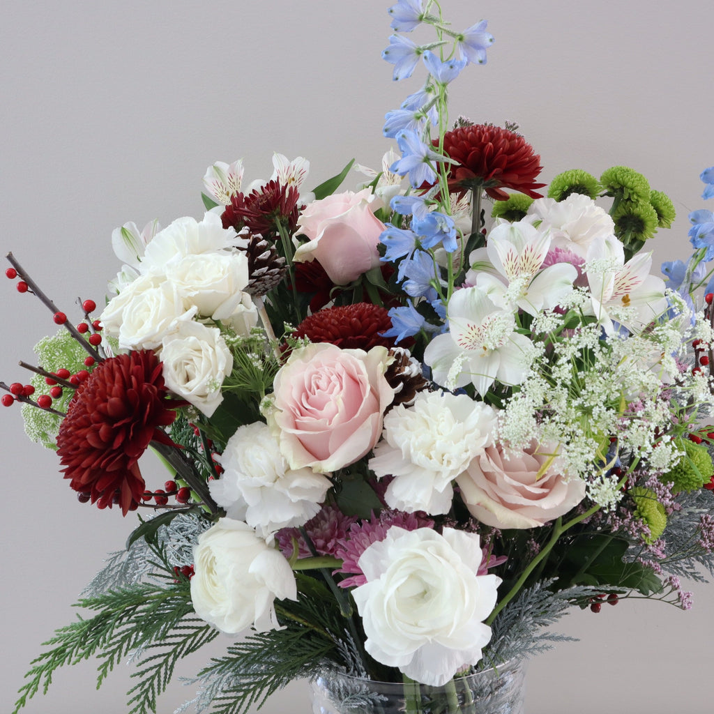 Grande size includes 3-4 stems of roses or(and) large chrysanthemum, lilies, anemones, ranunculus with mums and berries