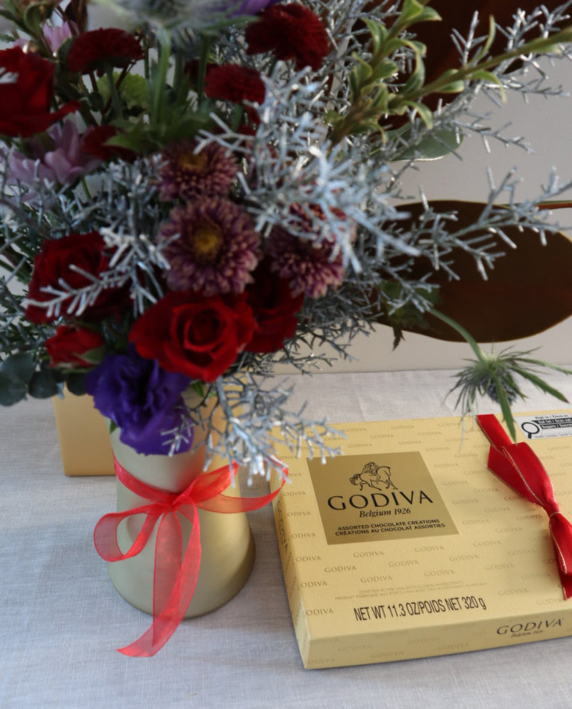 Make Christmas extra special with our Christmas-themed flower arrangement (grande-$85 value premium-$100 value) and Godiva chocolate box($35 dollar value)
